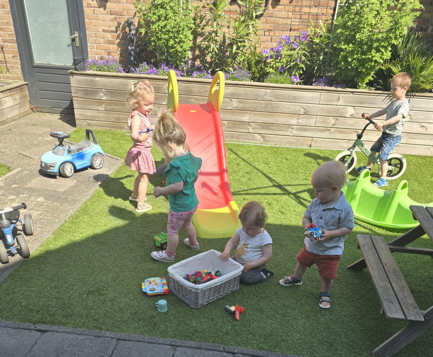 Haar dagen beginnen vroeg. ‘Tussen zeven en half negen worden de kinderen gebracht. We starten rustig met vrij spelen in de speelkamer en daarna werken we met een maandelijks thema. We lezen boekjes, doen woordkaarten, zingen liedjes en knutselen. Het zijn peuters en kleuters, dus hun spanningsboog is kort – spelenderwijs leren werkt het beste. Daarna hebben we een fruitmoment en trekken we eropuit: naar het bos, de speeltuin of gewoon lekker de tuin in om te voetballen of te rennen. Beweging is belangrijk voor kinderen, en buiten zijn doet ze zichtbaar goed.’