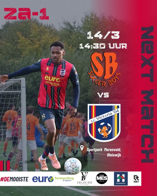 Komende zaterdag staat op Sportpark Merenveld in Bleiswijk de competitiewedstrijd tussen Soccer Boys en sc Victoria’04 op het programma. De thuisploeg bezet momenteel de achtste plaats op de ranglijst en verkeert in een goede reeks. Soccer Boys is inmiddels vier wedstrijden ongeslagen en boekte afgelopen weekend een 2-1 overwinning op Hillegersberg. Eerder werd ook een opvallende 8-0 overwinning op Meeuwenplaat behaald. Daarnaast speelde de ploeg met 3-3 gelijk tegen Botlek.